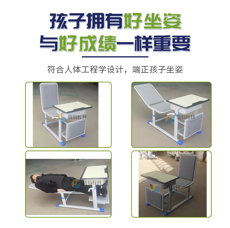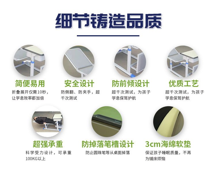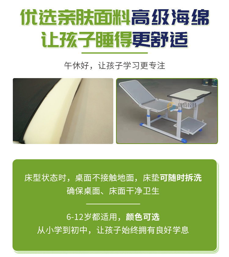 折疊午休課桌椅滿足日常學(xué)生學(xué)習(xí)書寫的使用功能,同時可以作為學(xué)生午休時的寢具使用,既符合人體工程學(xué)設(shè)計端正孩子坐姿,同時也滿足孩子午休需要,午休課桌椅的使用既節(jié)省了空間同時又為學(xué)生提供便利,可以滿足6-12歲學(xué)生的日常使用需要,可滿足小學(xué)、初中學(xué)生不同身高使用需求,同時加設(shè)海綿墊使用感更舒適。床型狀態(tài)時,桌面不接觸地面,床墊可隨時拆洗,確保桌面和床面干凈衛(wèi)生。同時平鋪和收納操作簡單單人獨立即可完成收合、打開步驟,讓孩子可以更好的學(xué)習(xí)和休息。